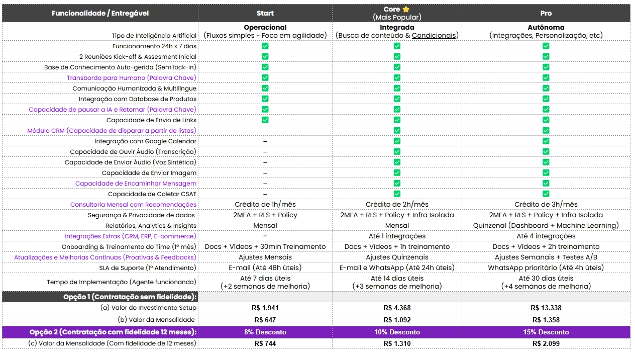 Não importa por onde você comece, seu AI Agent já nasce poderoso. Todos os planos incluem as ferramentas fundamentais para garantir um atendimento de alta qualidade desde o primeiro dia: